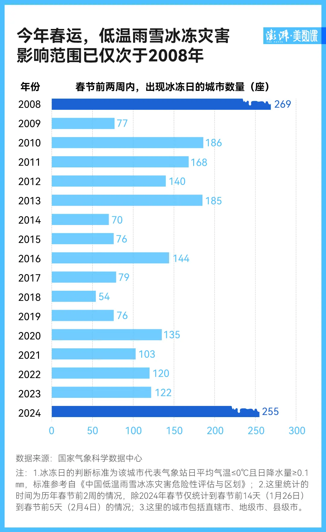 以日平均气温低于 0°C 且有降水的条件为标准,今年出现冰冻日的城市数量高达 255 座,远超往年正常情况,并接近 2008 年的数字。