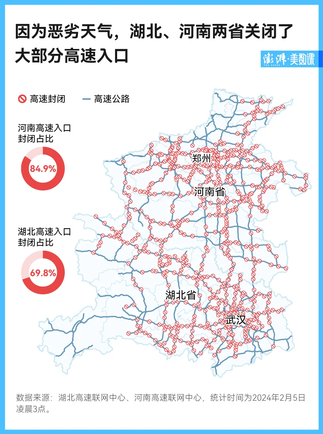 据湖北、河南两地的高速联网中心的数据,截至 2 月 5 日凌晨,两省都关闭了半数以上的高速入口,其中河南高速收费站点封闭比例达到八成,而湖北高速入口封闭占比也接近了七成。