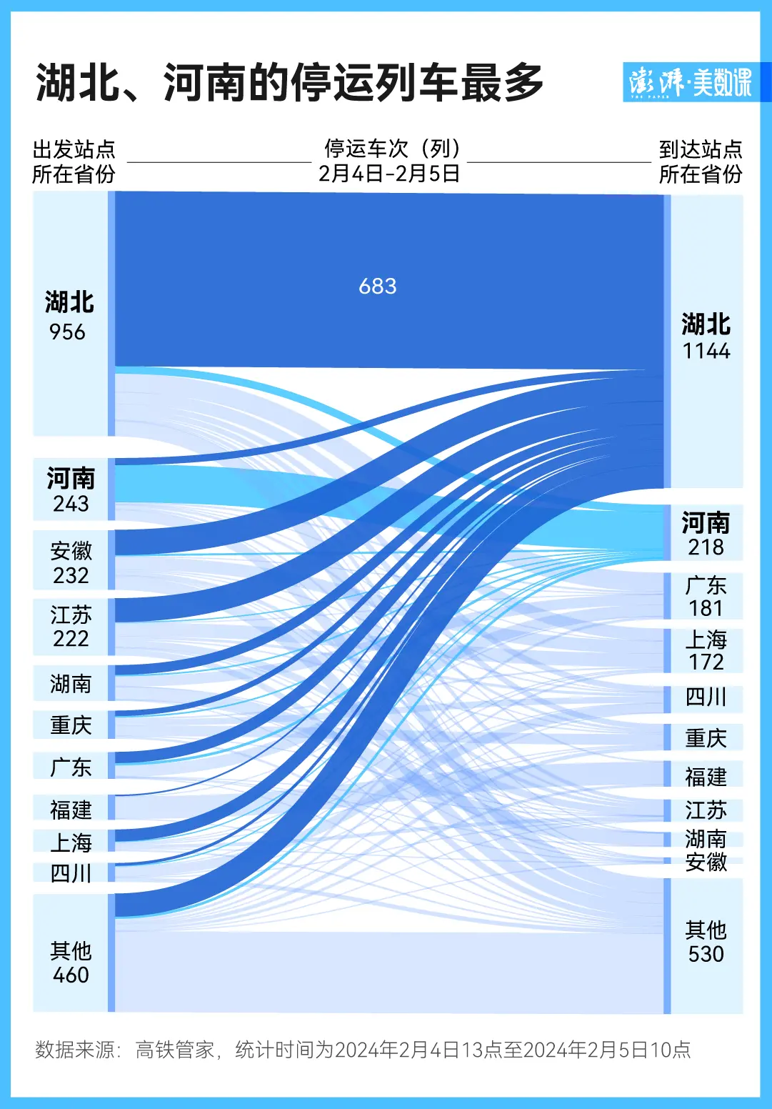 吴宁家所在的岳阳市毗邻湖北省,而湖北是此次冻雨灾害的中心,也同样是此次列车停运的重灾区。2 月 4 日、2 月 5 日的高铁数据显示,湖北的出发和到达列车都出现大面积停运的情况,分别有 956 趟和 1144 趟。