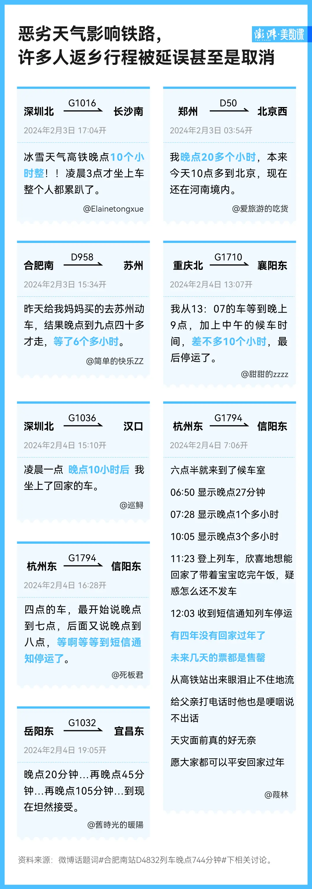在微博话题“合肥南站D4832列车晚点744分钟”下的评论,我们能看到有些人碰到了比 12 小时更久的晚点。