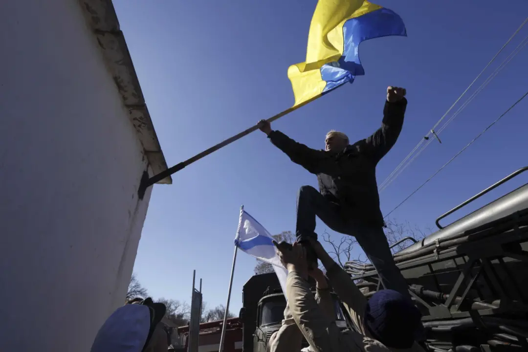 2014 年 3 月 ,一名男子在克里米亚诺沃韦多里夫卡的基地被夺取后摘下乌克兰国旗(图源:AP)