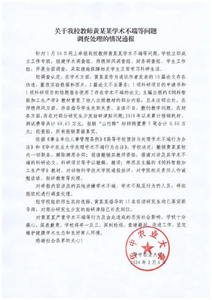 2月6日,华中农业大学发布《关于我校教师黄某某学术不端等问题调查处理的情况通报》