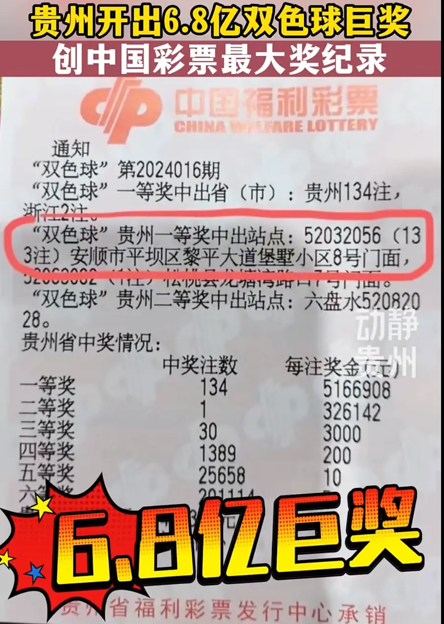 2024年2月6日晚,福彩双色球第2024016期开出136注一等奖,其中133注由贵州省安顺市平坝区黎平大道堡墅小区8号门面的52032056号销售网点售出,总奖金达到6.8亿多元。