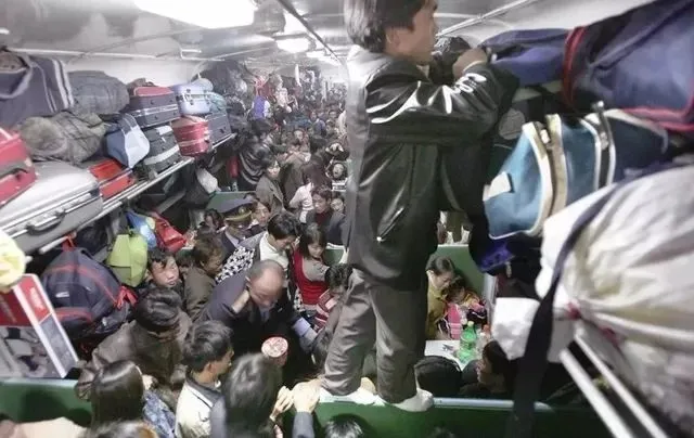 而且因为许多人买的都是站票,乘客一站就是几个小时,有人爬上行李架,还有人在座位底下铺张报纸当做“床”。