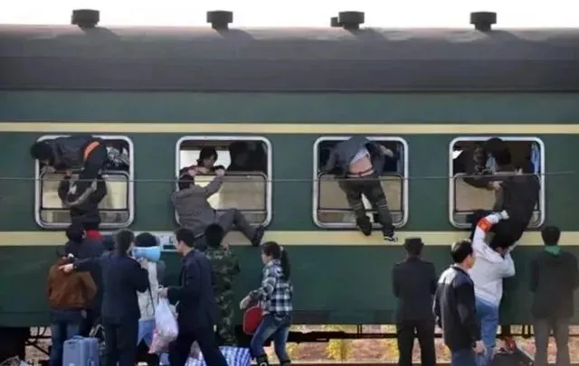 车里通常塞满了人,当火车停在车站轨道,有些着急上车的乘客还要从窗口爬进去。