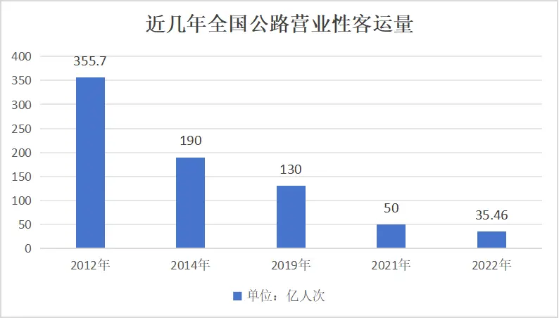 交通运输部数据显示,在2012年,全国公路营业性客运量355.7亿人次,之后一路下滑,到2022年,只余下35.46亿人次。