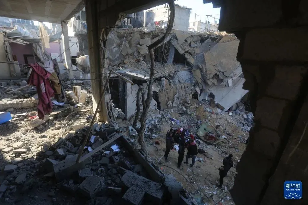加沙地带南部城市拉法,巴勒斯坦人查看以军空袭后的建筑废墟。