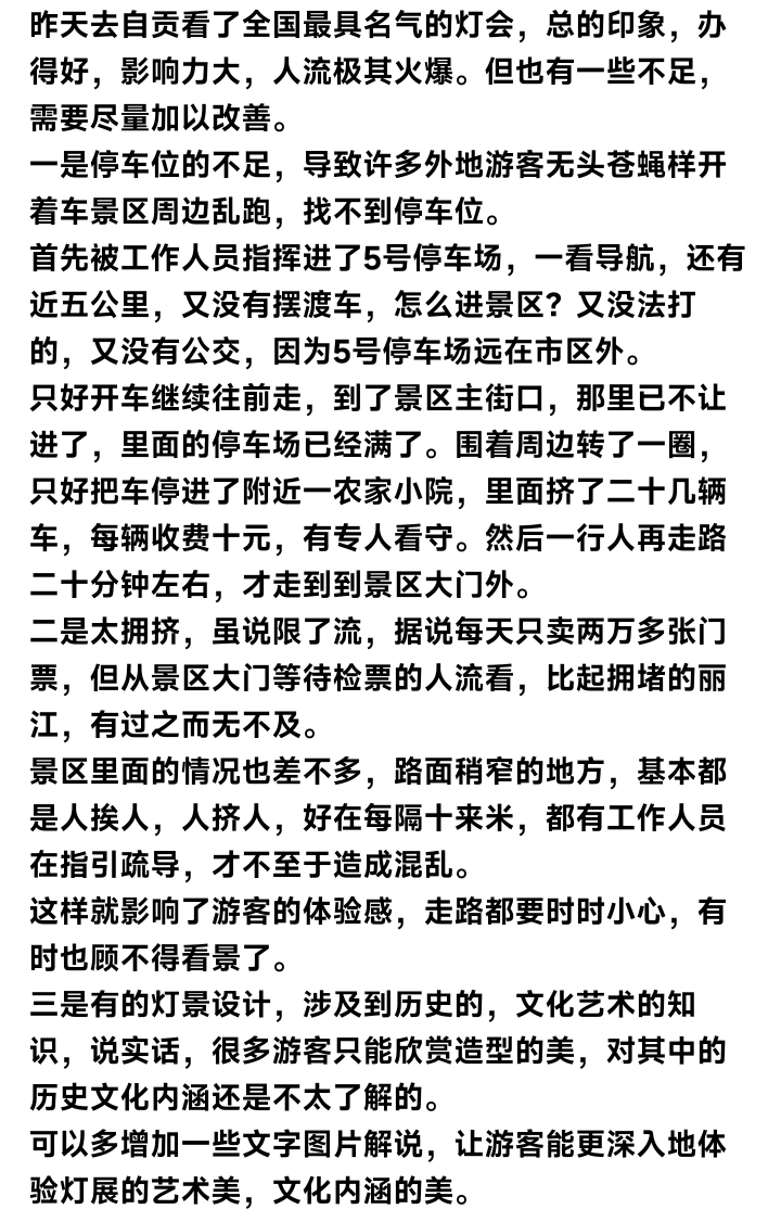 也只能找外地人的钱,本地人基本不鸟它。亲戚来了没办法只得硬着头皮去。说实话别看越来越大型知名度越来越高灯组越来越高大繁琐,但是早就失去了灯会的真正意义。三十年前的灯会还有灯谜,到处的吊灯都有不重复的灯谜,让人驻足观看让人绞尽脑汁的猜测答案,现在只能说是大型的灯光科技秀 |