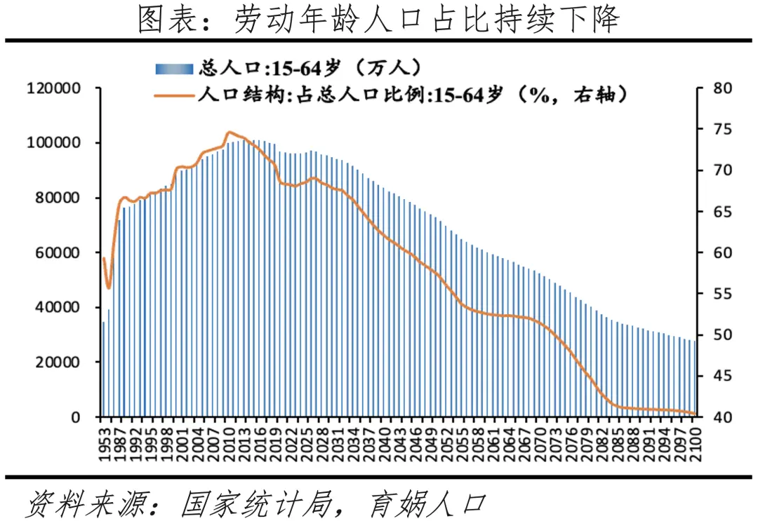 劳动规模持续萎缩、劳动人口占比大幅下降,2010-2022年15-64岁的劳动年龄人口规模从10亿降至9.6亿,占比从74.5%降至68.1%,预计到2050年降至58%左右。2023年16-59岁人口86481万人、较2022年减少1075万人,占全国人口的比重61.3%、较2022年下降0.7个百分点。中国劳动年龄人口比例及规模分别在2010、2013年见顶,随后进入快速下滑阶段,根据育娲人口《中国人口预测报告2023》“中方案”,2050年劳动年龄人口占比下降到57.5%,2100年劳动年龄人口占比下降到40.5%。人口数量红利消失,劳动力成本大幅上升,挑战中国世界工厂地位,社会创新创业活力下降,经济潜在增速下行。