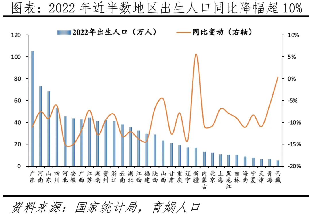 分省看,广东出生人口数量遥遥领先,河南、山东、河北等人口大省出生人口同比降幅介于5%-10%。从出生人口看,2022年出生人口前三的省份分别为广东、河南、山东,分别为105.2万、73.3万、68.2万人,合计占全国的27.4%,仅广东省出生人口超百万。从出生人口变动看,2022年安徽、河北两省出生人口同比降幅超过15%,福建、辽宁、江西、云南等13个省级以上区域出生人口降幅介于10%-15%,贵州、山东、吉林等14个省级以上区域出生人口降幅介于0%-10%,仅西藏、新疆两地出生人口同比小幅正增。