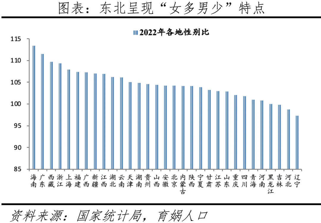 分省看,2022年,辽宁、河北、吉林、黑龙江4个省级以上地区人口性别比在100以下,河南、青海、四川、重庆等15个省级以上地区介于100-105,天津、云南、湖北等10个省级以上地区介于105-110,海南、广东在110以上。整体看,东北呈现“女多男少”的特点,辽宁、吉林、黑龙江分别为97.3、99.8、99.96,均不超过100,人口大省广东性别比高达111.6。