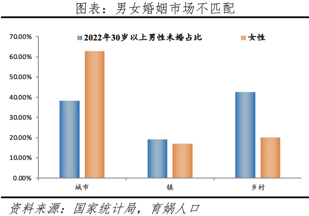 需要注意的是,男女比例失衡、女性意识觉醒等原因造成婚姻市场匹配困难,农村“剩男”和城市“大龄剩女”问题突出。第一,男女比例失衡。比如00后男女性别比约115,男性比女性多超1100万,90后男女性别比约110,男性比女性多近900万。第二,女性多偏好不低于自身条件的男性,男性多偏好不高于自身条件的女性。婚姻成本越来越高,男性在婚姻市场的主动性受家庭资源、财富水平的影响。经济发展和受教育水平提高给女性提供了更多就业机会,社会地位上升。女性不再只作为“家庭主妇”,而是进入职场实现自己的人生价值。高学历女性往往偏好不低于自身条件的男性,在事业发展期面对巨大的恋爱、结婚、养育等成本时,如果没有遇到物质与理想同时匹配的择偶对象,更倾向选择不婚甚至不恋,加大婚姻市场匹配难度。2022年,中国30岁及以上未婚男性有超过60%分布在村镇、一般为较低学历;未婚女性有超过60%分布在城市、一般学历较高。