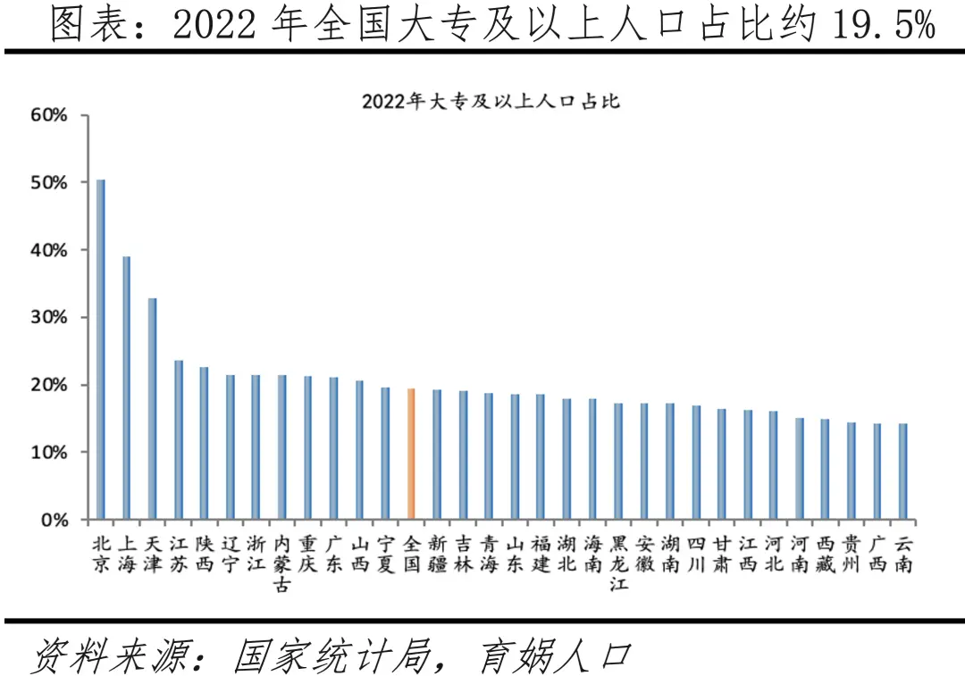 我国仍然拥有全球少有的庞大劳动年龄人口,面临人口负担加重问题,需要推动“人口红利”向“人才红利”转变。根据国家统计局数据,2010-2022年我国16-59岁人口平均受教育年限从9.67提升至10.9年。拥有大学文化程度人口占总人口的约15.5%,相较美国的42%、加拿大的51%还有提升空间。健康水平的提高、文化素质等方面的提高,对于改善劳动力的供应质量有重要的作用,有助于推动“人才红利”加速释放。