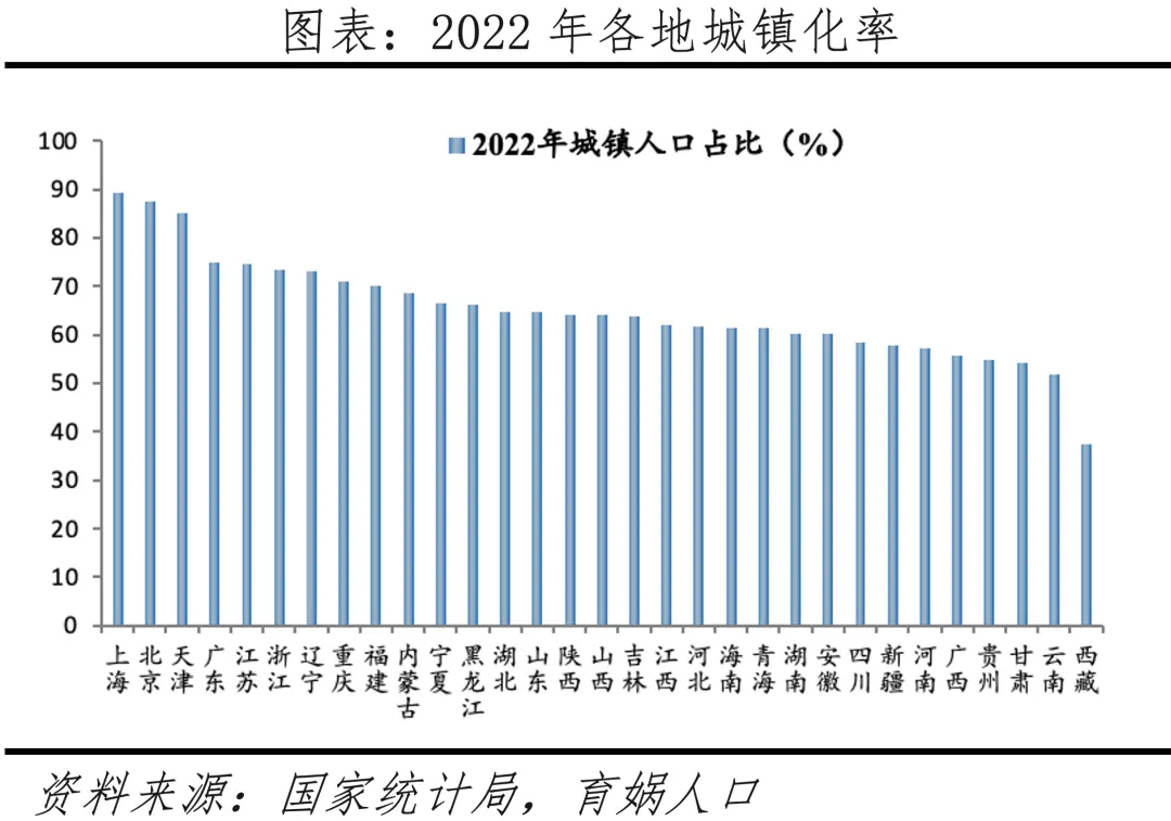 分区域看,东部发达地区城镇化率高于中西部地区。2022年上海、北京、天津等9个省级以上地区城镇化率大于70%,处于城镇化的稳定发展期;内蒙古、宁夏、黑龙江等14个省级以上地区城镇化率介于60%-70%,城镇化进程处于减速发展的末期;四川、新疆等7个省级以上地区城镇化率介于50%-60%,城镇化进程处于减速发展的初期,还有较大提升空间;西藏自治区城镇化率只有37.4%,主要与地理环境、资源分布等因素有关。