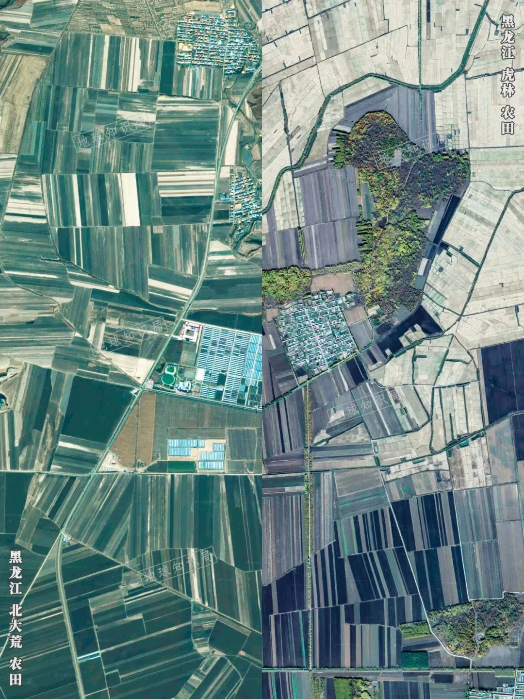 由于气候的原因,黑龙江的熟制是一年一熟。论单位面积产量,是其实比不过一年两熟甚至三熟的华南地区的。但总产量却是江苏的2倍、广东的6倍、浙江的12倍,因为这里的地,实在是太多了,黑龙江人均耕地是全国均值的4倍,是最接近美国中部大农场的省份,这在卫星图上也肉眼可见。