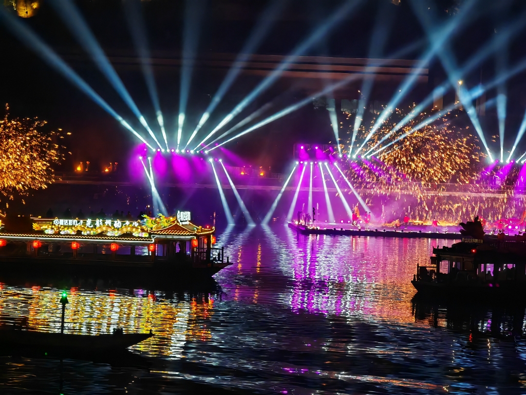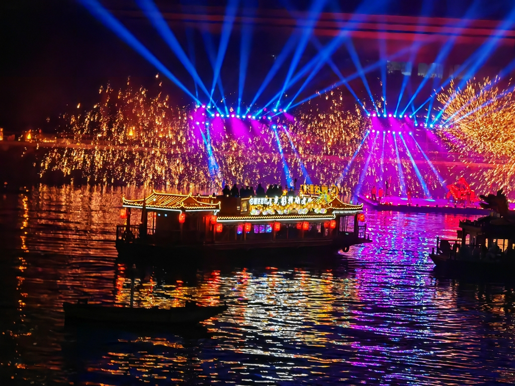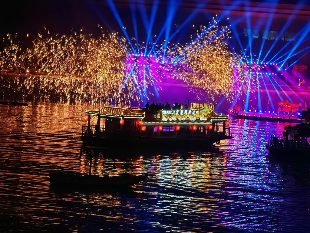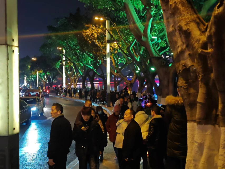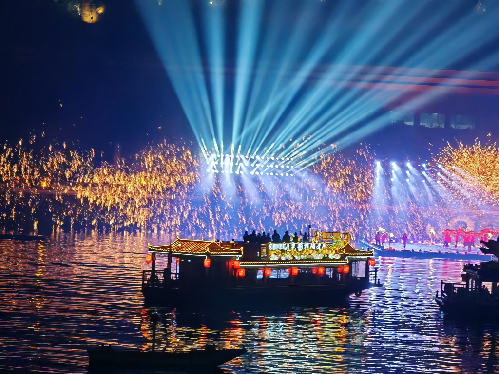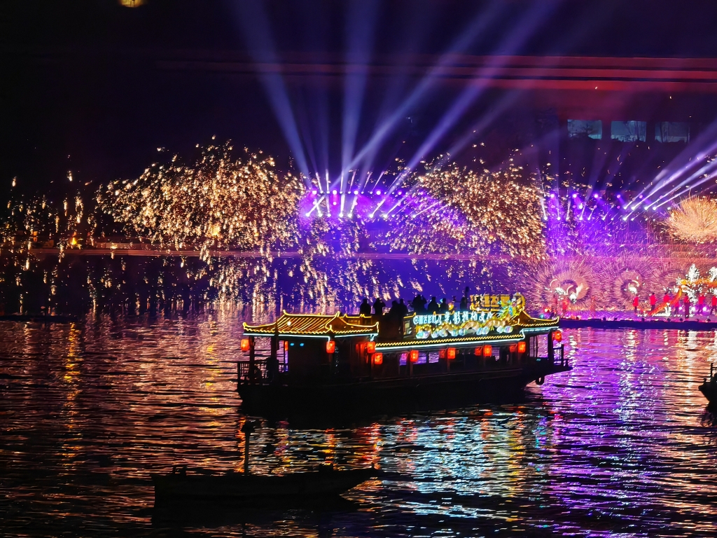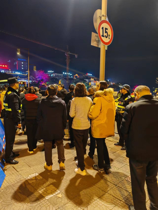 春节,每天晚上张家沱岸边人山人海,争先恐后前来沱边观看打铁花灯光秀。还有几条夜游釜溪船上的乘客也不放过这个机会。在滨江路岸边沿河本来有牢固的木、铁栏杆,但怕人多拥挤出事故,又在栏杆内加了一道厚厚的档板,不少警察在栏杆和档板间来来去去,维持秩序。