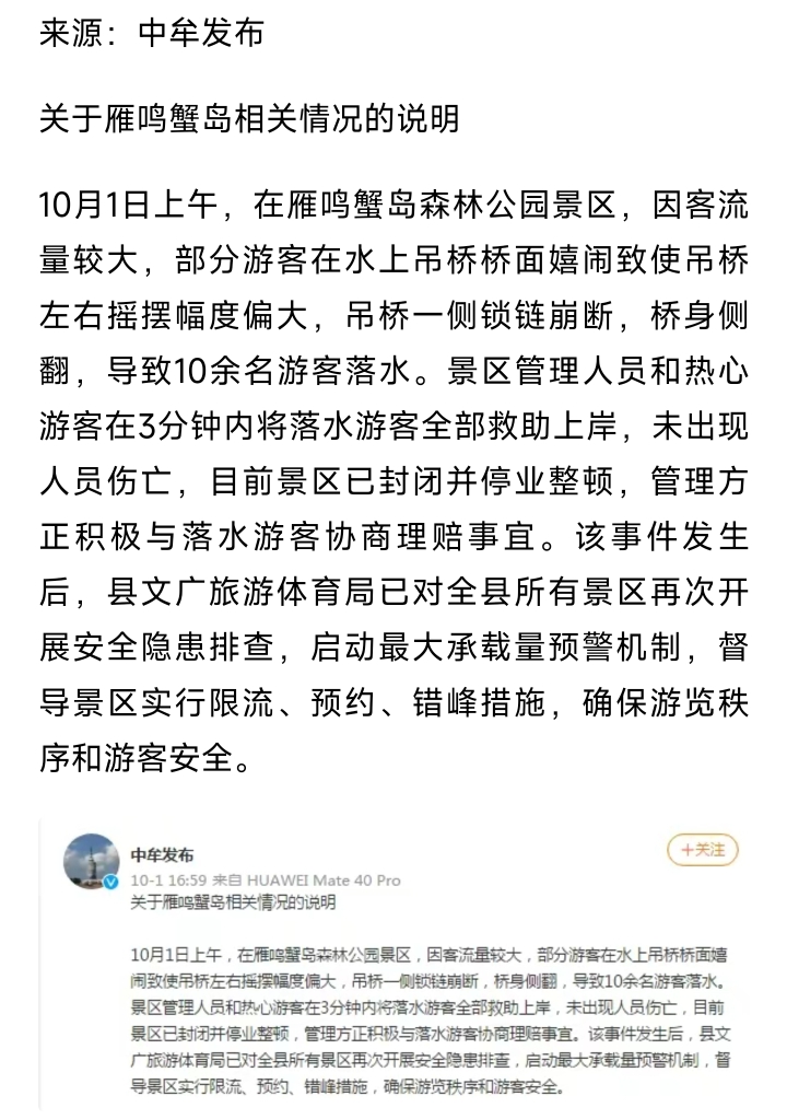 [盐都杂谈] 河南中牟1景区吊桥锁链崩断桥身侧翻致10余名游客落水:无人员伤亡,景区停业整顿