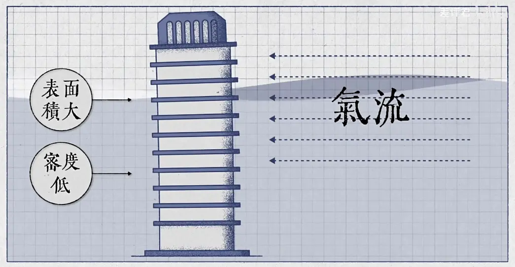 我们前面说过,楼层越高,侧向风荷载越大,而在超高层建筑上,风会引发一种特殊现象叫 “ 涡旋脱落 ”。
