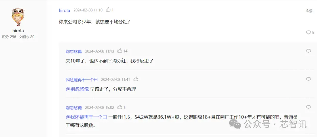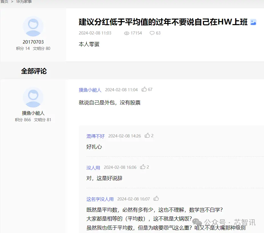 值得注意的是,在华为内部论坛——心声社区上,也有华为员工吐槽称,在华为工作10年了也没达到平均分红,我得反思了。”