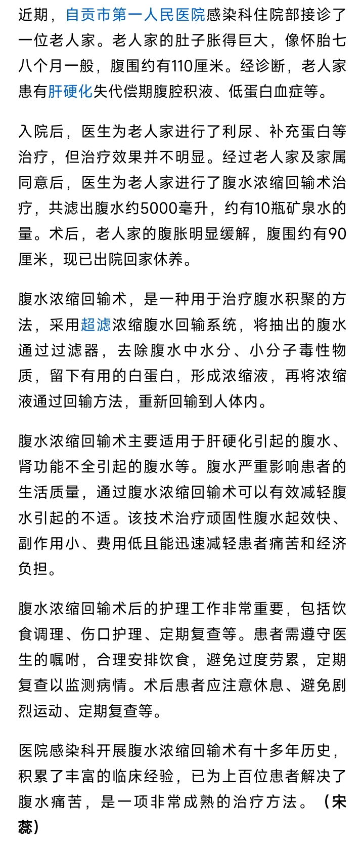 自贡市第一人民医院感染科为老人滤出5000毫升腹水