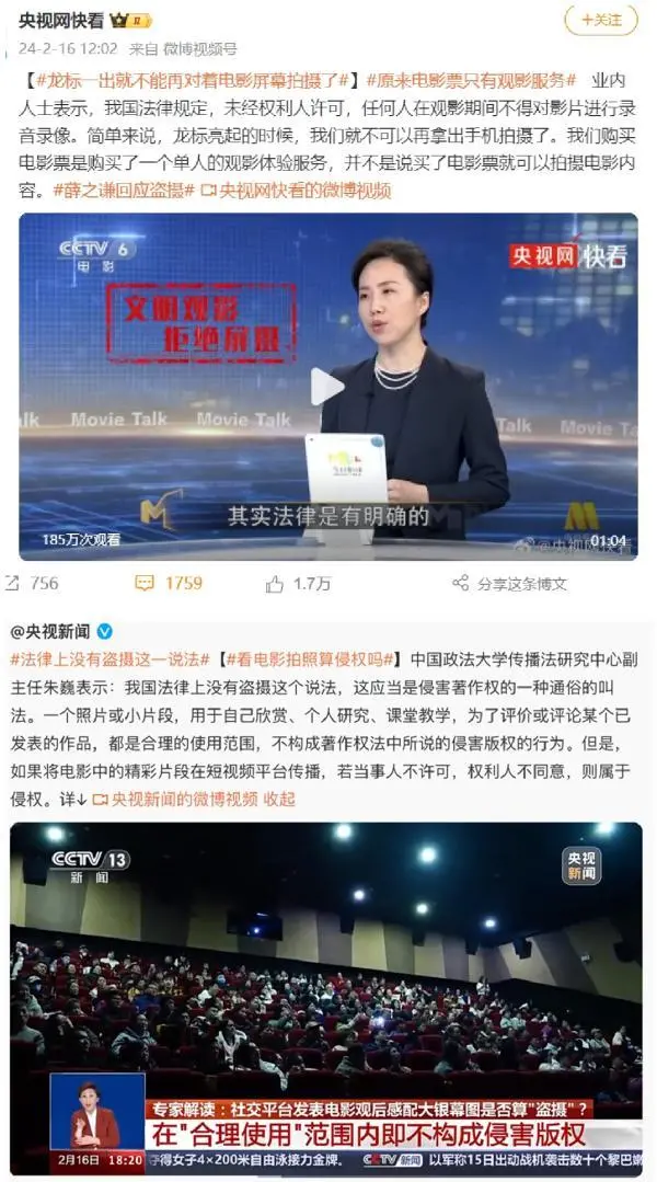 央视6套、央视13套等新闻节目都就此采访、连线相关专家答疑。但有意思的是,两档节目里的专家的回应,在舆论场里分别被概括成了“龙标一出就不能再对着电影屏幕拍摄了” 和“法律上没有盗摄这一说法”两种看似完全对立的说法。于是,讨论的双方选边站队、“各取所需”,吵得沸反盈天。