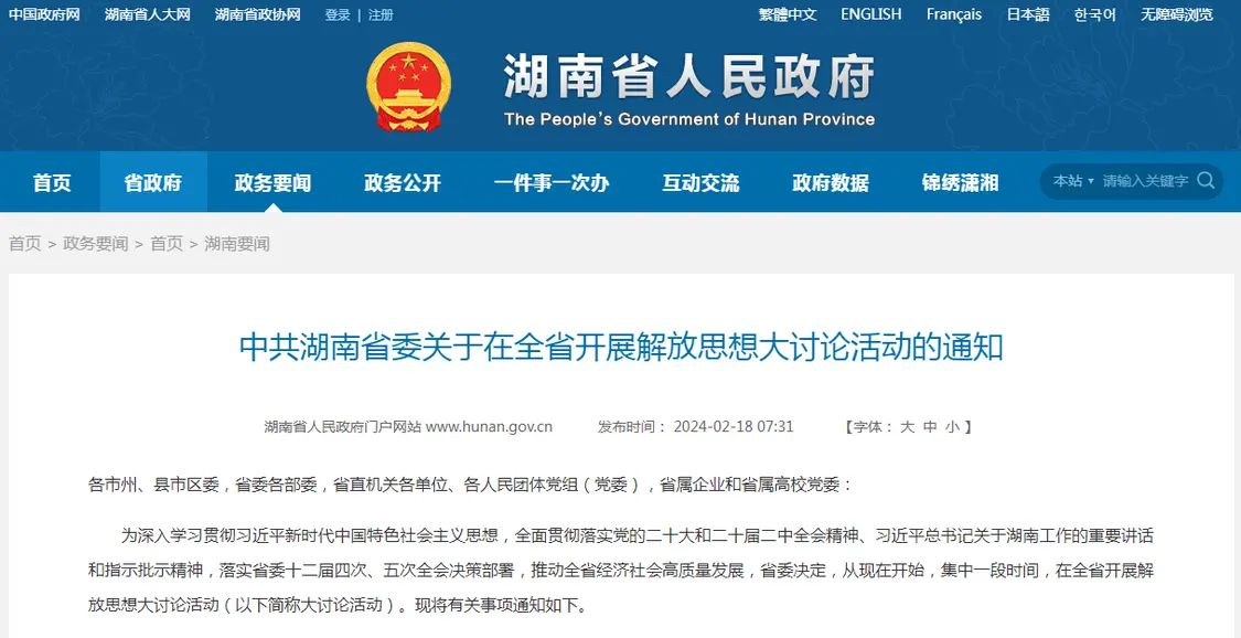 据湖南政府网站,龙年新春第一个工作日,2月18日,湖南省委发出《关于在全省开展解放思想大讨论活动的通知》。省委决定,从现在开始,集中一段时间,在全省开展解放思想大讨论活动。
