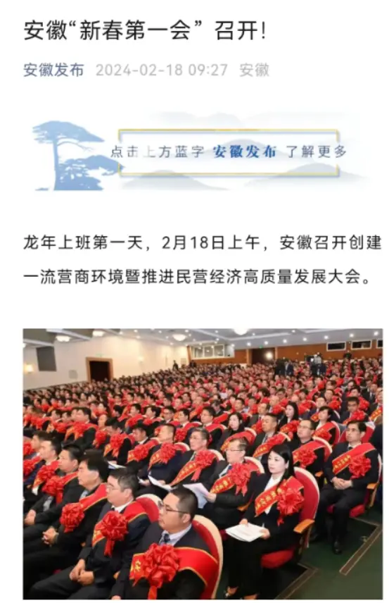 据安徽发布官方微信号,龙年上班第一天,2月18日上午,安徽召开创建一流营商环境暨推进民营经济高质量发展大会。