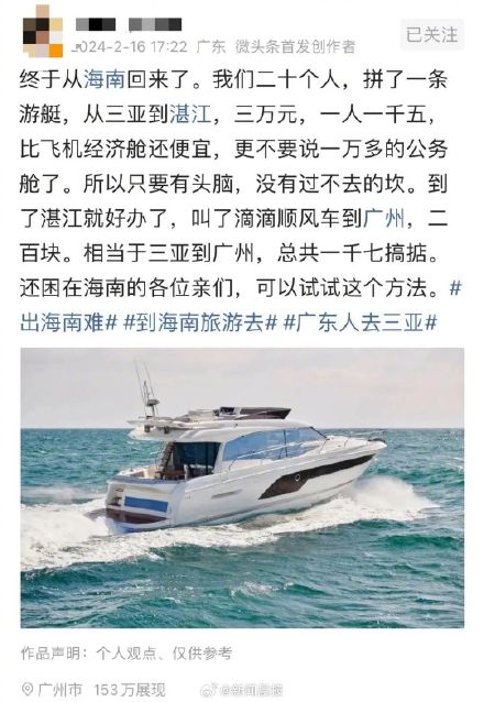随着春节假期结束,多地迎来返程高峰。其中,大量海南游客离岛难问题引发广泛关注。2月16日,有网友发文称,其与19名游客花3万元包游艇从三亚顺利回到广东。 18日,三亚多家游艇租赁公司工作人员称公司未开通此航线。三亚海事局一工作人员表示,因涉及游客人身安全,没有三亚到湛江租赁游艇的这条航线。 近日,海南游客离岛机票价格上涨、出岛难问题引发关注。记者搜索多个平台发现,春节假期结束后两日,从海南三亚、海南海口至广州、北京等地的机票价格飙升至5000元以上,部分航班机票价格突破万元。 2月16日,有网友发文称,其与19名游客一起拼了一艘游艇从海南三亚回到广东湛江,每人1500元,一共花费3万元。该网友称,这个价格从海南回广东比经济舱的机票还便宜,并表示:“还困在海南的各位亲们,可以试试这个方法。” 18日上午,记者尝试联系该网友,截至发稿未获回应。 就网帖所述情况,三亚一家游艇出租公司工作人员告诉记者,网帖所述花三万元从三亚租游艇到湛江并不可行,“吸引流量,骗人的,所有游艇出租公司没有三亚到湛江这条航线,航线是需要上报海事局批准的。” 另一家游艇出租公司工作人员也表示,“那是忽悠你的”,游艇价格按照时间计算,出海三小时价格为3500至4000元,且三亚到湛江距离远,乘坐游艇并不现实。另外,该工作人员还表示,目前离岛人数太多,港口也很紧张,“那就是个段子。” 除此之外,还有三亚当地游艇租赁公司工作人员介绍,目前公司提供游艇出行服务都是在三亚附近的海域,不会航行到更远的地方。据其所知,三亚当地游艇公司目前都没有推出从三亚到广东湛江的服务。 “除了出海线路要上报海事局外,每次游艇出行有多少人去,有多少人回等信息也要上报,以免游客在艇上出现人身安全问题。”上述游艇租赁公司工作人员表示。 三亚海事局工作人员告诉记者,因涉及游客人身安全问题,没有三亚到湛江租赁游艇的这条航线,“如果是自己的船自己开,(海事局)只会看适航证,船只要满足航区就可以,但涉及租赁,就需要看经营范围了,航线也要有批准。”
