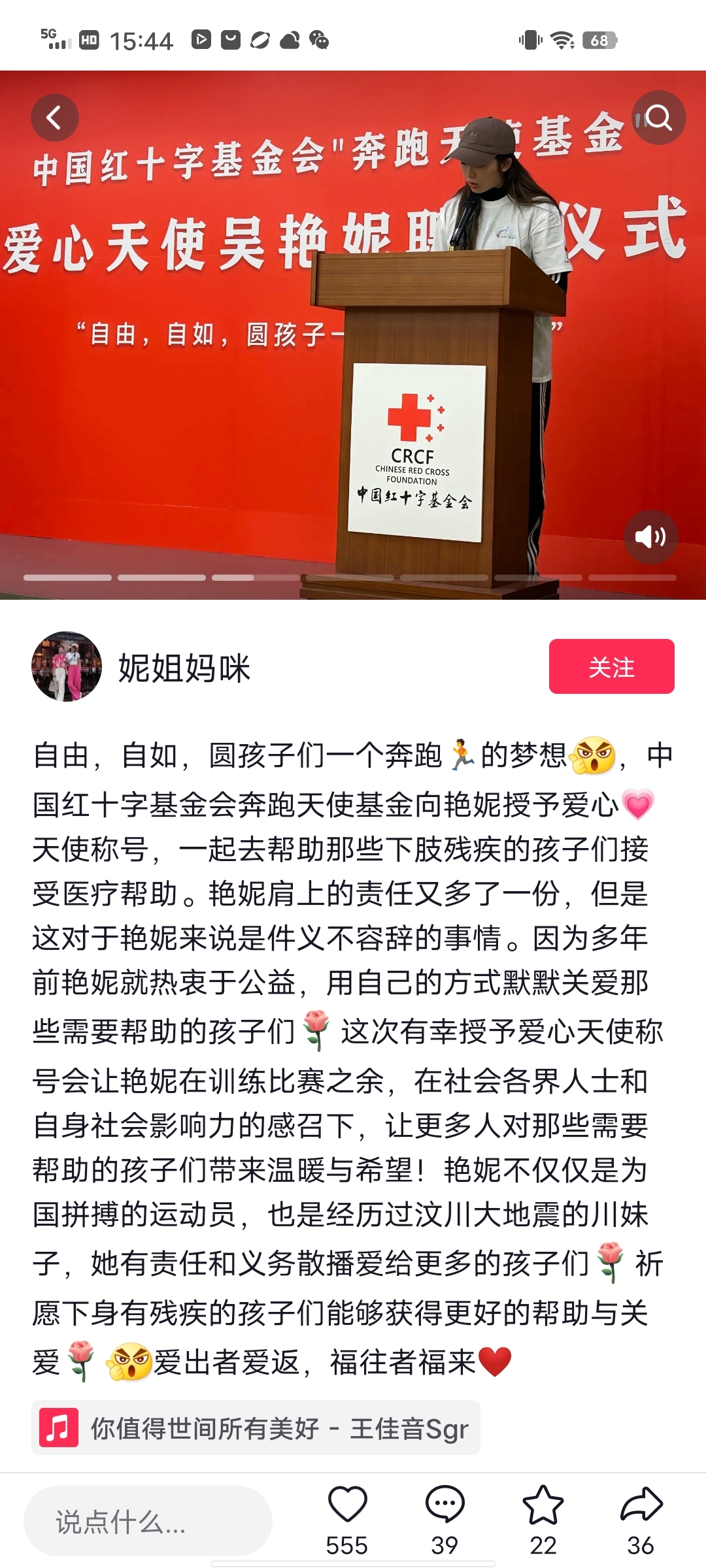 “自由,自如,圆孩子们一个奔跑的梦想[强],中国红十字基金会奔跑天使基金向艳妮授予爱心天使称号,一起去帮助那些下肢残疾的孩子们接受医疗帮助。艳妮肩上的责任又多了一份,但是这对于艳妮来说是件义不容辞的事情。因为多年前艳妮就热衷于公益,用自己的方式默默关爱那些需要帮助的孩子们[玫瑰]这次有幸授予爱心天使称号会让艳妮在训练比赛之余,在社会各界人士和自身社会影响力的感召下,让更多人对那些需要帮助的孩子们带来温暖与希望!艳妮不仅仅是为国拼搏的运动员,也是经历过汶川大地震的川妹子,她有责任和义务散播爱给更多的孩子们[玫瑰]祈愿下身有残疾的孩子们能够获得更好的帮助与关爱[玫瑰][强]爱出者爱返,福往者福来”