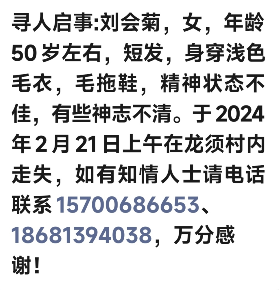 四川省自贡市富顺县骑龙镇龙须村刘会菊,女,年龄50岁左右,短发,身穿线色毛衣、毛拖鞋,精神状态不佳,神志不清。于2024年2月21日上午在龙须村走失。