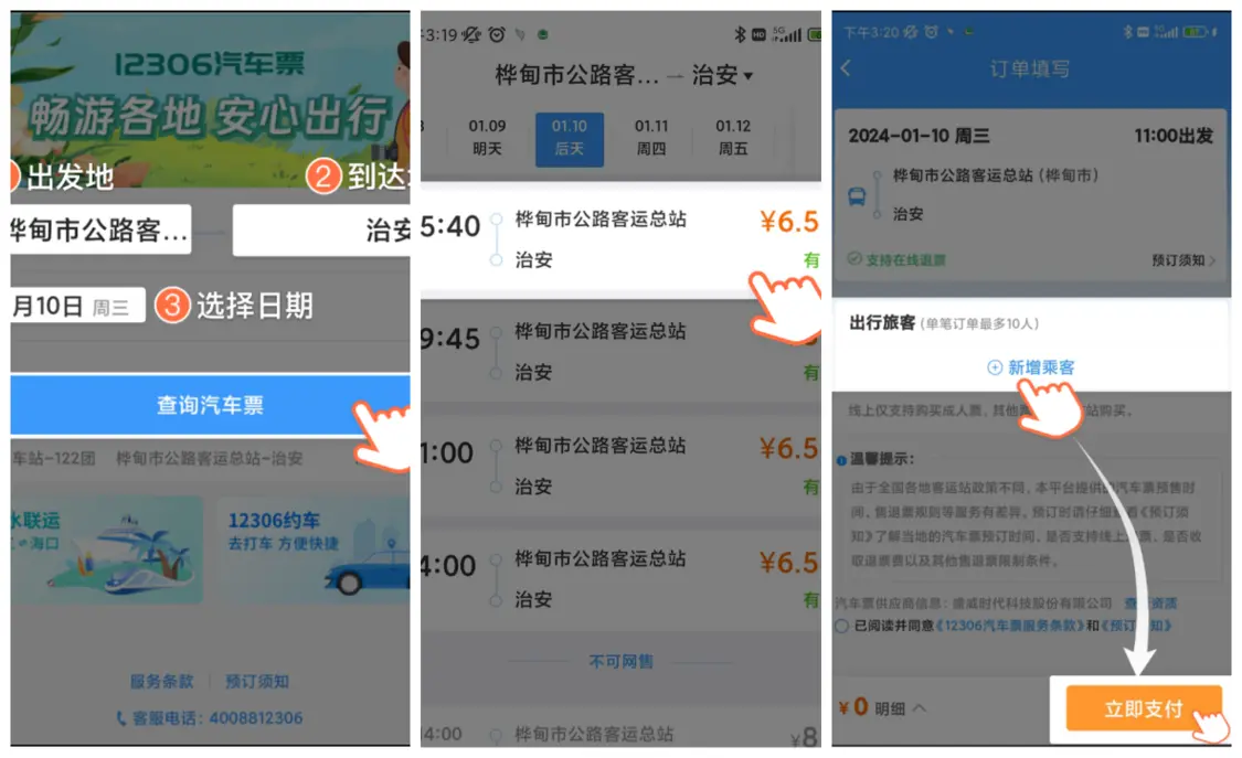 购票步骤 1.查询汽车票 2.选择班次 3.确认班次及乘车人信息后支付下单