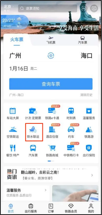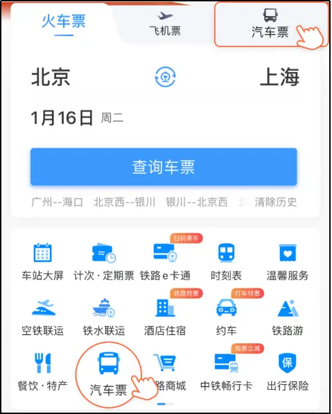 目前12306汽车票覆盖全国2700多个车站。 铁水联运出行 铁路12306“铁水联运”服务,一次购票,就能在火车、轮船、巴士间无缝换乘。 购票步骤 点击12306App首页的“铁水联运”小图标或通过火车余票查询页“铁水联运”推荐专栏进入。