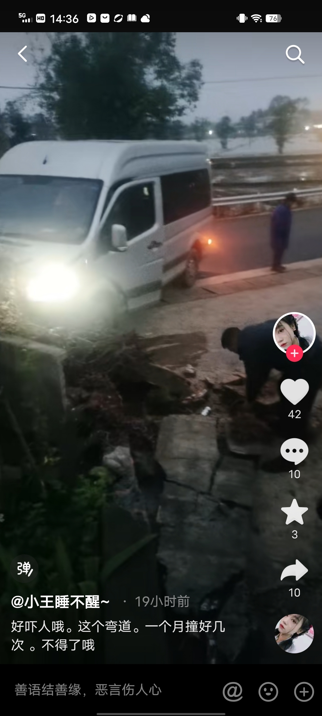 “好吓人哦。这个弯道。一个月撞好几次 。不得了哦”