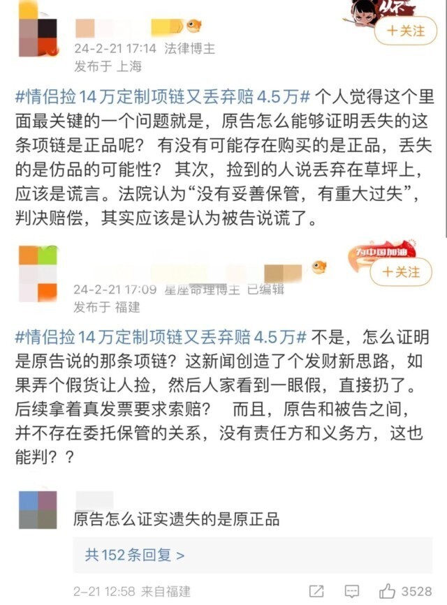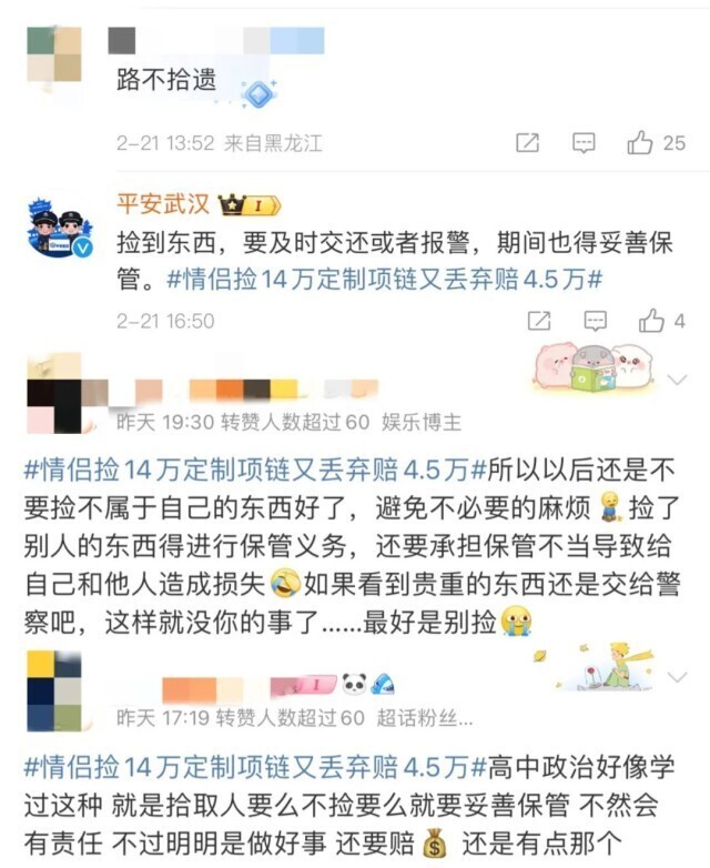 近日 上海闵行法院公布的一起失物纠纷 引发广泛关注 一对情侣捡到了他人遗失的价值14万元的项链 但当失主要求返还项链时 二人称项链已经被扔了 无法返还 最终,法院经审理认为 这对情侣负有未妥善保管的责任 判定二人赔偿失主损失45000元 具体事情经过 上海闵行法院介绍,2022年8月4日,原告贾某购入某品牌定制项链一条,价值142400元。2023年10月5日6时39分,贾某及其朋友一行人在经过某商场3楼扶梯平台时,其所佩戴的定制项链掉落在扶梯口处。 当日6时56分,被告林某及其女友途经3楼扶梯平台,发现遗落在原地的项链,随即捡走,二人边查看边带离现场。据派出所的询问笔录所载,二人称“看到项链是黄色的,以为是黄金的,就随手装在口袋里带走了”。 贾某发现项链遗失后,便至派出所报案。后因调解无效,贾某诉至法院,请求被告林某及其女友返还其项链。贾某诉称:被告在拾得原告遗失项链后,以已经丢弃为由,拒不返还,已经严重侵害原告的合法权益,故要求被告返还原物,若不能返还,则需照价赔偿。 被告则辩称,捡到该项链后以为不值钱,后扔在了小区草坪,目前无法证明项链后又被谁捡走。此外,林某及其女友认为,不能证明案涉项链为原告所述品牌,不认可原告主张的项链价值。二人提出,愿意出于人道主义补偿原告1万元。 上海闵行法院经审理涉案事实和双方证据 认为该案有以下两个争议焦点 其一,被告拾得项链后丢弃 是否承担损失赔偿责任? 法院认为,被告在拾得项链后,本应返还权利人或送交有关部门并妥善保管,但被告私自将该项链带至家中,并自认已将项链丢弃在小区草坪。现有证据证明被告拾得项链后未妥善保管导致案涉项链灭失,被告对此存在重大过失。因此,被告应当承担相应民事责任,在无法返还原物的情况下,应对原告的损失承担折价赔偿责任。 其二,原告丢失项链的损失如何确定? 法院表示,原告提供的关于案涉项链价值的微信聊天记录、照片、转账记录等证据,能够形成证据链,并达到民事诉讼证据高度盖然性的证明标准,原告为购买该项链花费了142400元。但考虑到案涉物品系定制品,从国外代购,存在代购费用支出,且原告已佩戴一年有余,亦存在折旧。 最终,法院综合全案事实、结合双方证据,酌定被告应当赔偿原告损失45000元。后,原告上诉,二审法院驳回上诉,维持原判。案件现已生效。 相关话题一度冲上 微博上海同城热搜第一 网友展开了激烈的讨论 有网友表示 “怎么证实遗失的是正品?” 也有网友表示 “万一拾到者并没有丢弃, 而是占为己有了呢?” 还有网友表示 “捡到东西丢了很正常吧?” “还得负责保管?” 当然 警察叔叔和更多的网友表示 路不拾遗 如果捡了要及时报警 并且妥善保管 因为 拾金不昧不仅是传统美德 更是法律义务 我国民法典规定 拾得遗失物后 拾得人应当返还失主 若不予归还 则是一种拒不履行法定义务的行为 根据民法典,拾得人在遗失物送交有关部门前,有关部门在遗失物被领取前,应当妥善保管遗失物。因故意或者重大过失致使遗失物毁损、灭失的,应当承担民事责任。从刑事责任的角度看,以非法占有为目的,非法占有代保管的财物、遗忘物、埋藏物,拒不归还的,视财产价值可能会涉嫌构成侵占罪。因此,法律赋予拾得人保管、及时通知、返还或送交的义务。