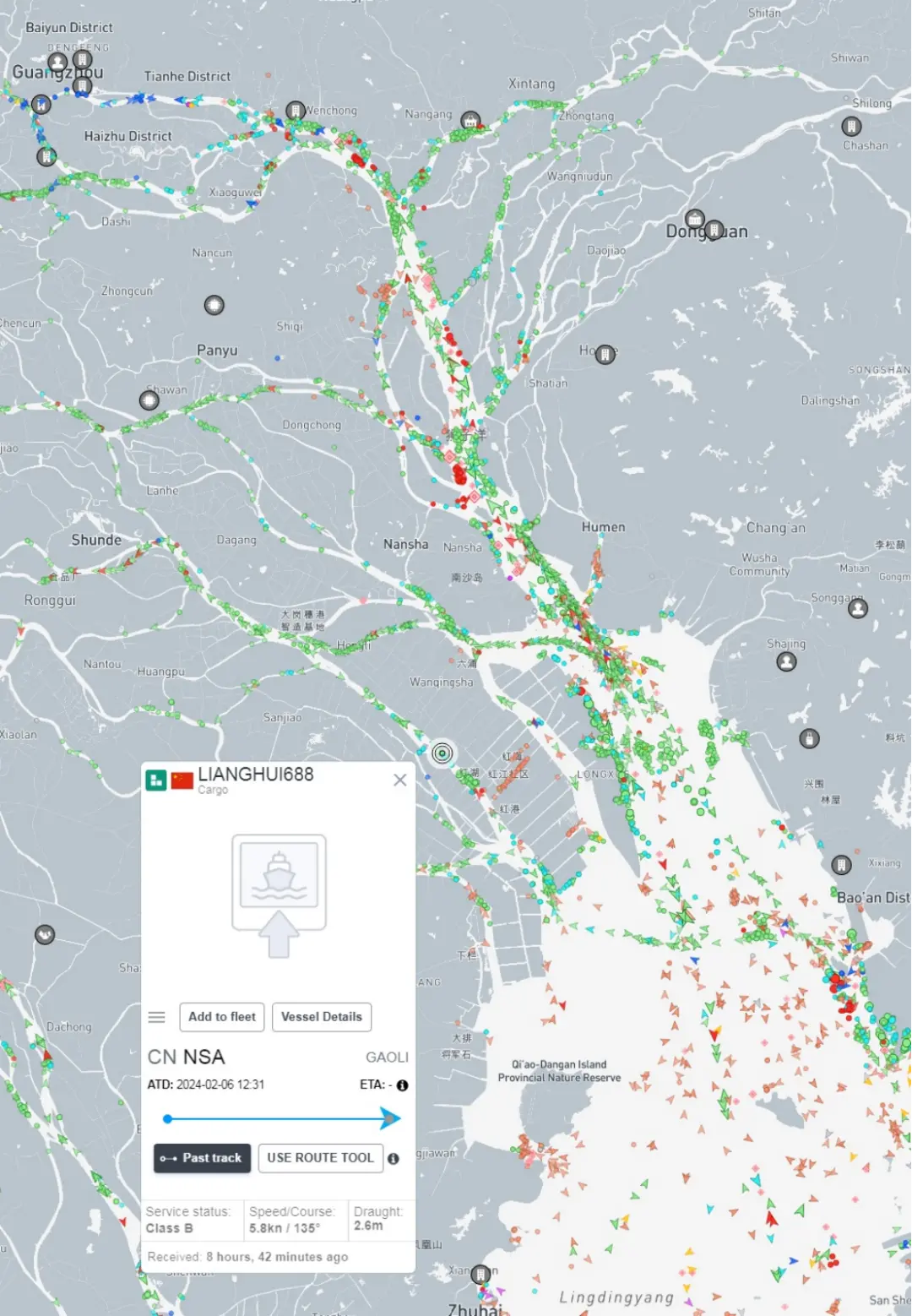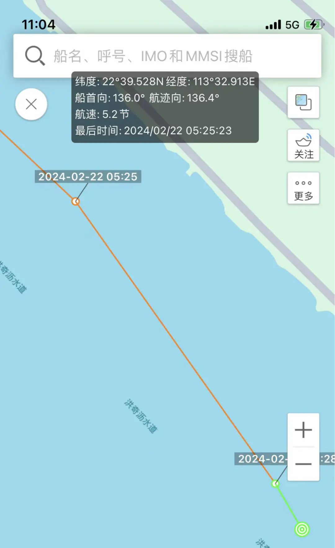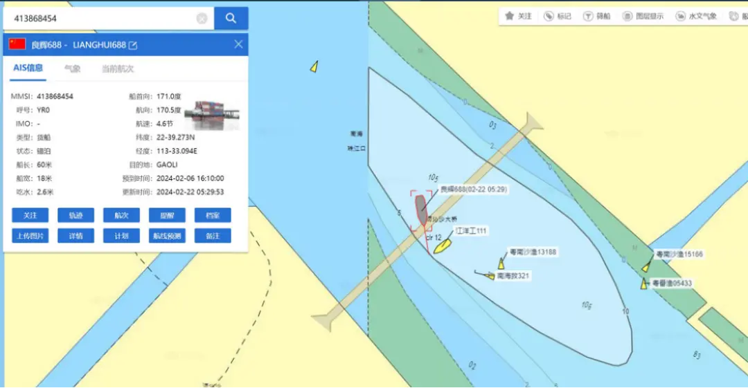 把船舶广播的AIS收录起来,就构成了船讯网络。查询“良辉688”号2月22日5时29分53秒最后一次发送了AIS,航速为4.6节(海里/小时),航向170度(接近正南),即将穿过沥心沙大桥。