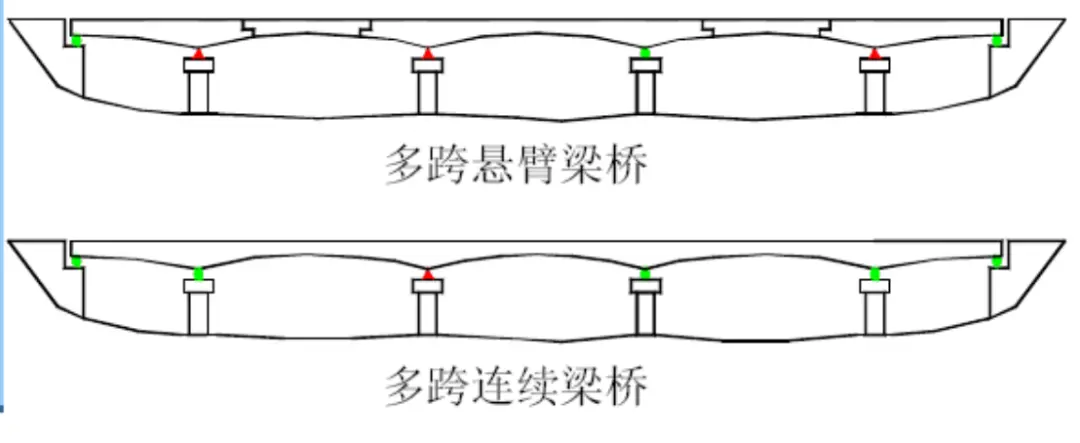 连续梁具有三个或更多个支撑点,除了两端外,在中间还有支座连接。多个支承处共同承担荷载,可适应复杂的受力状况,主要用在大跨径桥梁建设中。