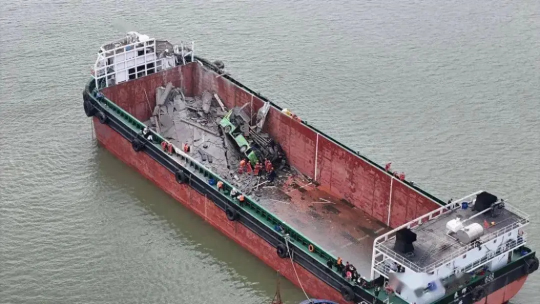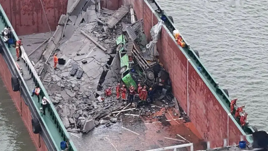 其中2辆小汽车落水,其他3辆(公交中巴、中型货车、电动摩托)随桥梁板落到船上船舱内。公交司机、电动摩托驾驶者以及2辆落水汽车上3人均不幸遇难。