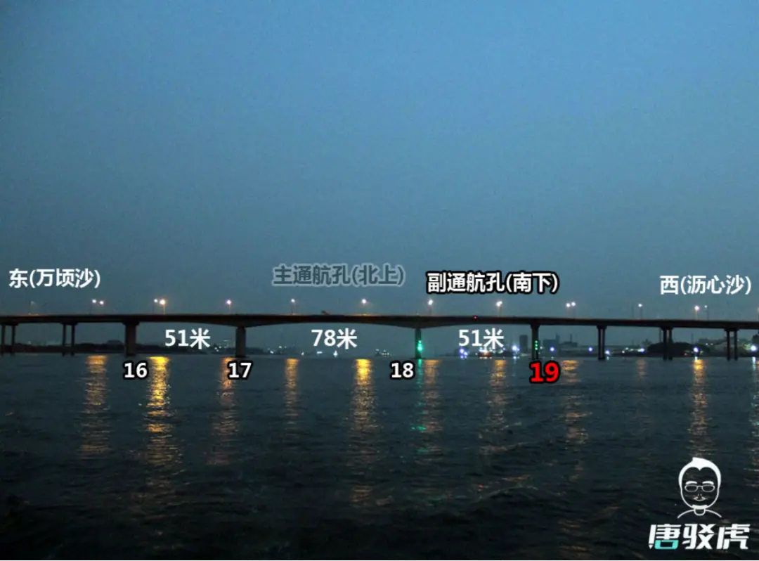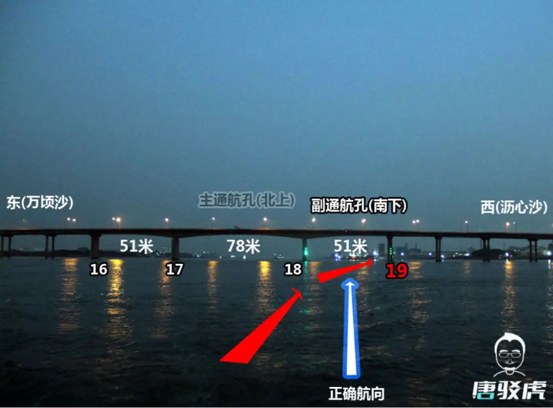 因此船只行驶也遵循靠右的原则,所以整体航道靠右岸沥心沙一侧。南下使用右侧的副通航孔,北上使用主通航孔。左侧的副通航孔备而不用。这就是行船法则。