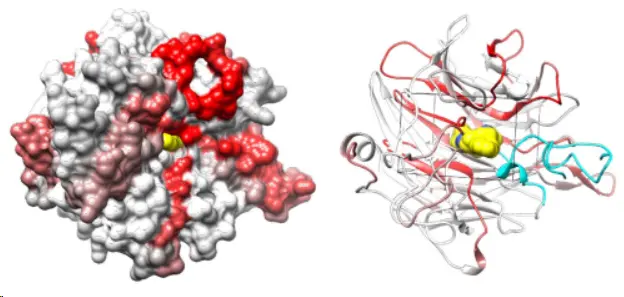 整合素αV的β-螺旋桨结构域的蛋白质表面(左)和螺带(右)模型说明了Cpd_AV2(黄色)在破坏整合素β5的βA环(青色;绿色表示关键相互作用残基赖氨酸287)和整合素αV之间相互作用中的作用。整合素αV的β-螺旋桨结构域通过规范化CRISPR-tiling评分(NCS)进行着色。