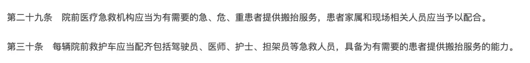 根据《院前医疗急救管理办法》,其中只规定了医疗救护员的工作包括搬运、护送患者,但对于医师、护士是否有责任、有义务搬运患者,并没有明确列出。