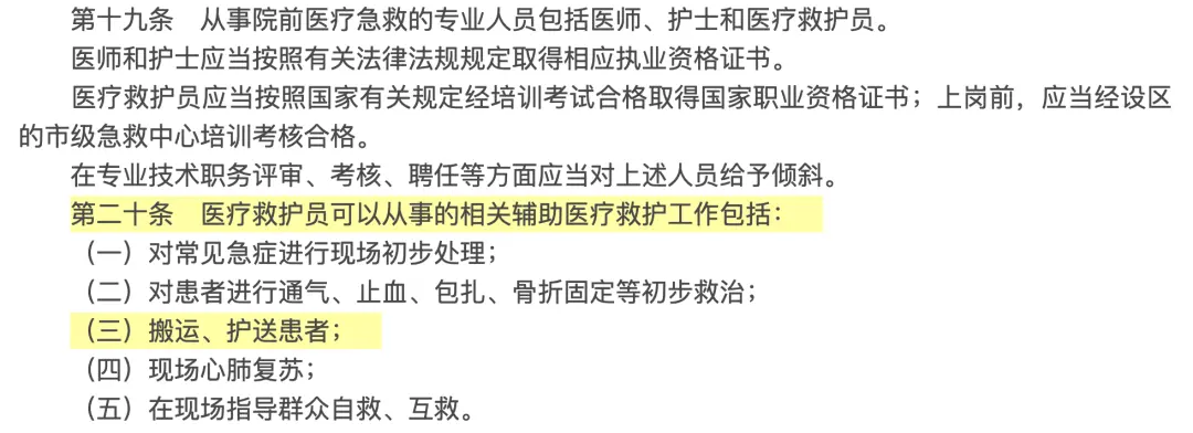 我国《院前医疗急救管理办法》规定,从事院前医疗急救的专业人员,除了医师和护士之外,还包括医疗救护员。在这一分工中,经过培训考核上岗的医疗救护员,可以从事搬运、护送患者等相关辅助医疗救护工作。