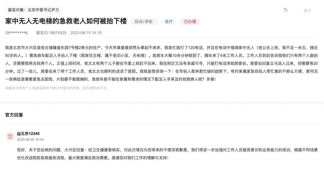 据北京市大兴区一名网友反映,去年8月,家里老人突感不适,她拨打 120 求助时反复说明家住无电梯老旧小区,需要急救车配足人手抬患者下楼。但到达现场后,工作人员表示,四人里只有两个人能抬人,还需要患者家属再另外去找两个人。最终,在居委会的帮助下才顺利护送患者入院。