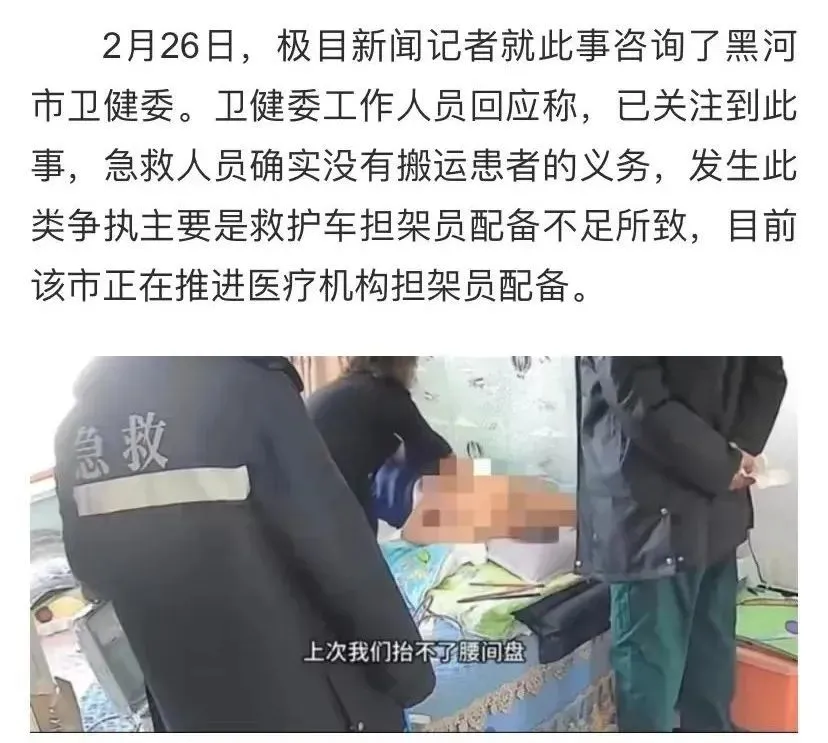 据极目新闻报道,2月26日,黑河市卫健委工作人员回应称:已关注到此事,急救人员确实没有搬运患者的义务,目前正推进医疗机构担架员配备工作。