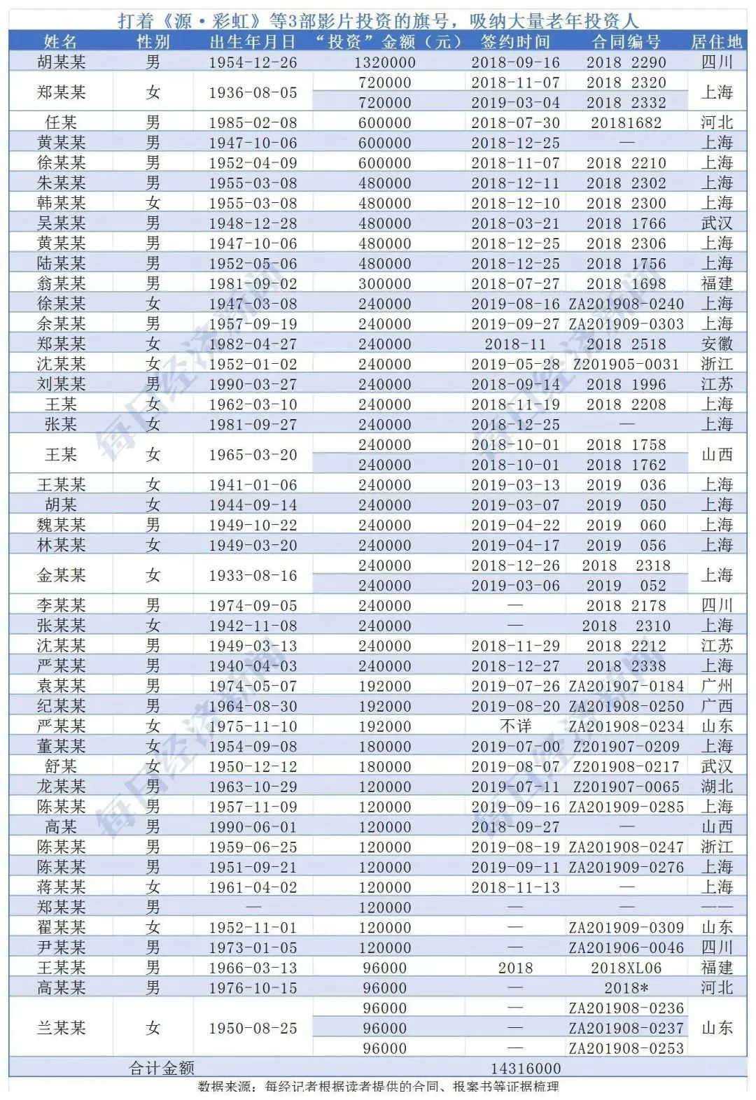 还有一个73岁的退休人员刘丹(化名),她之前是一名高级工程师,2019年7月先后花了70多万元买了《源·彩虹》影片0.24%的投资收益权,后来又花18万元买了《黎明勋章》的份额。