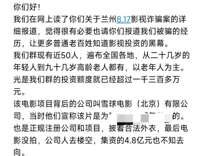 每日经济新闻联合兰州市公安局发起对“8•17”影视投资诈骗案件线索的收集工作后,收到的读者邮件