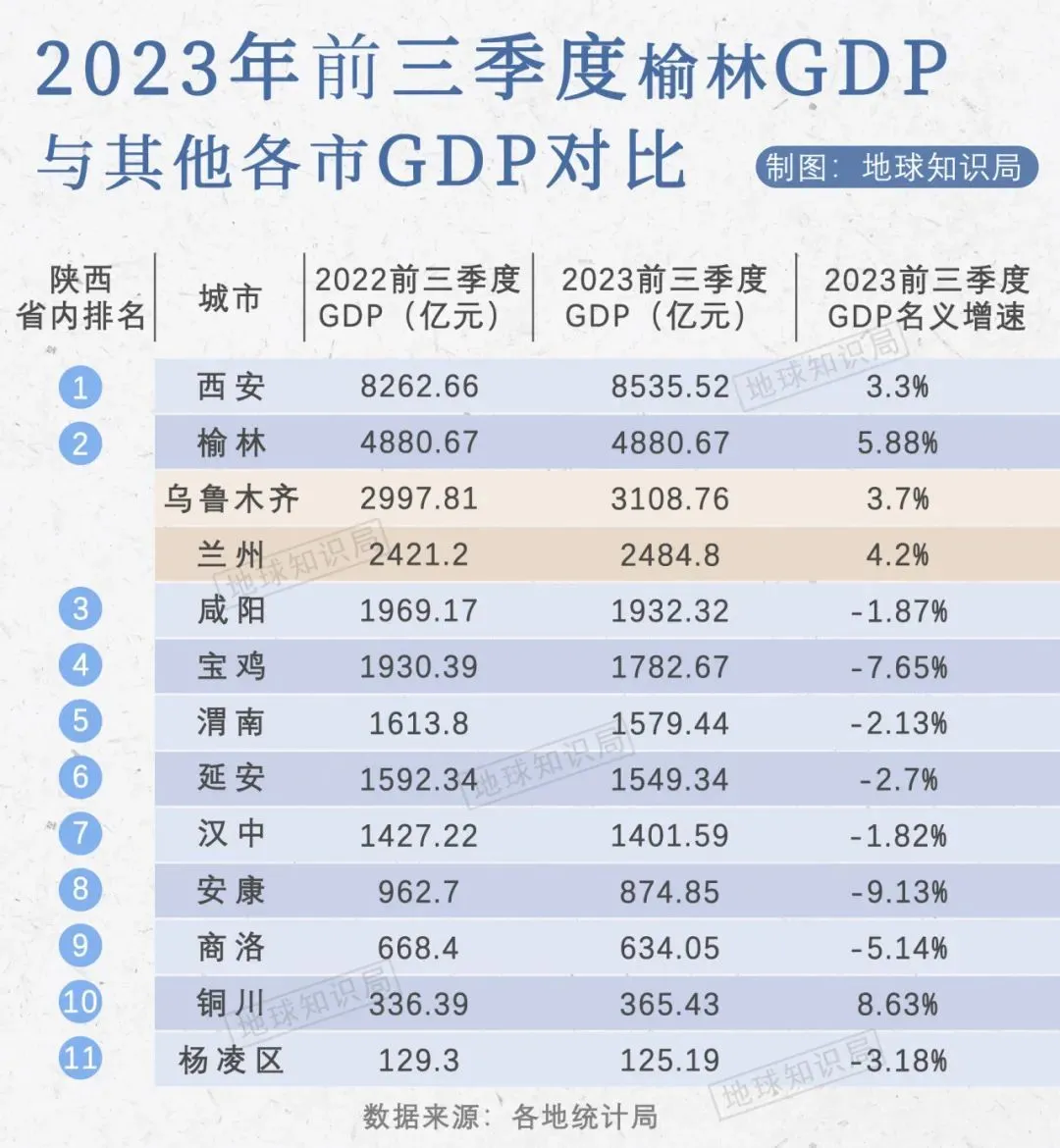 即使拉上整个西部的首府一起比,榆林也远超兰州、乌鲁木齐,稳坐西部第五城。