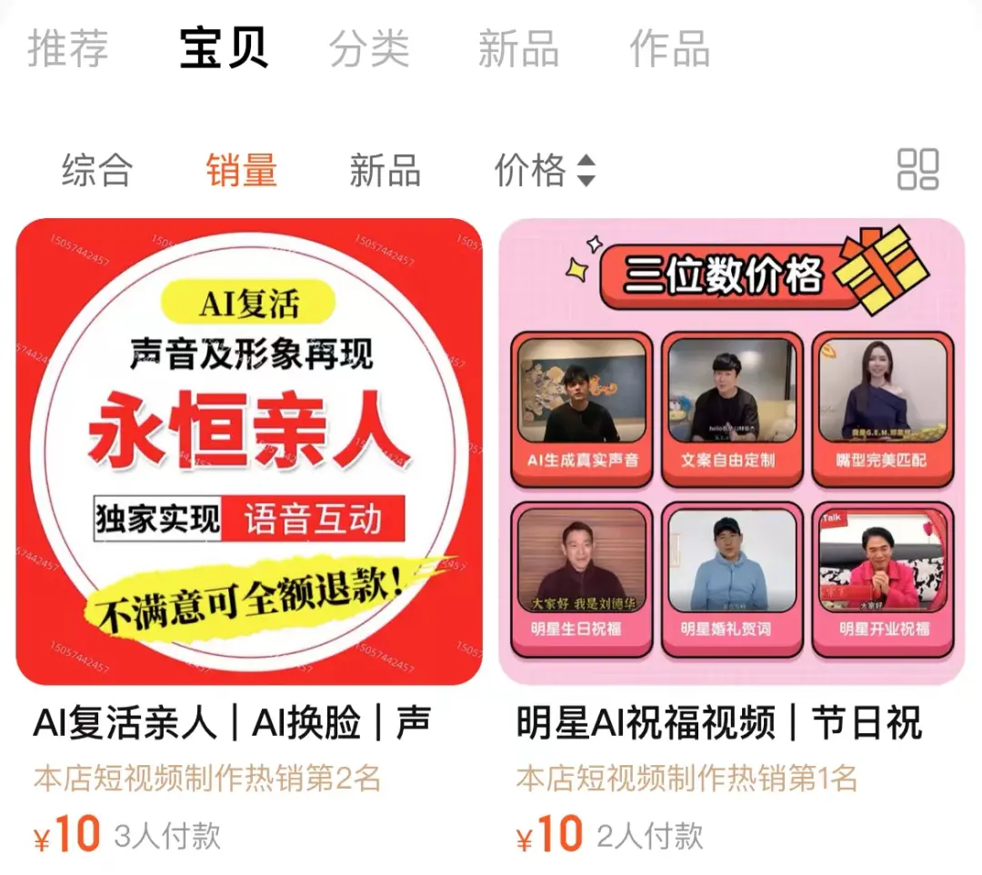 还有一位商家的店铺中有两个产品,分别是“AI复活亲人”和“明星AI祝福视频”,标价均为10元,销量均为个位数。