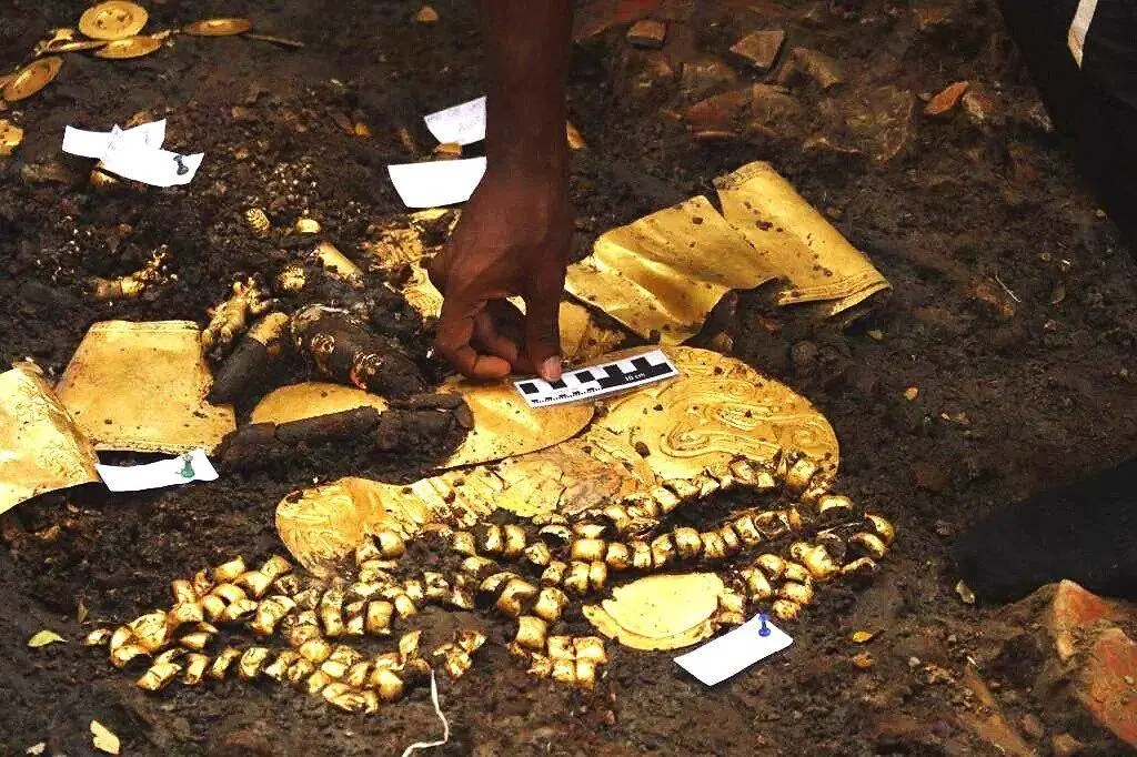 在发掘古墓的过程中,科学家们发现了大量黄金陪葬品,包括手镯、两条金珠腰带、鳄鱼形状的耳环、镀金抹香鲸牙齿耳环和圆形金盘。此外,考古人员还发掘出了一对男女形状的耳环、两个铃铛、狗牙制成的裙子和一套骨笛。