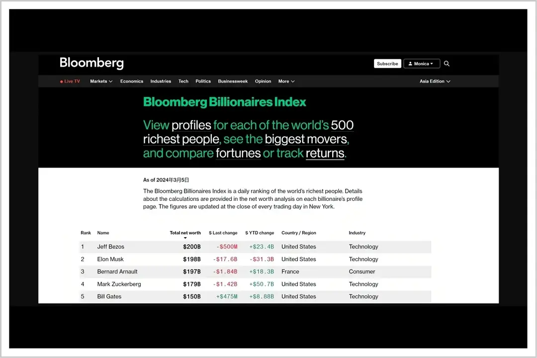 3月4日的彭博亿万富翁指数榜单显示:亚马逊创始人贝索斯超越马斯克,以2003亿美元的身家再度问鼎世界首富。