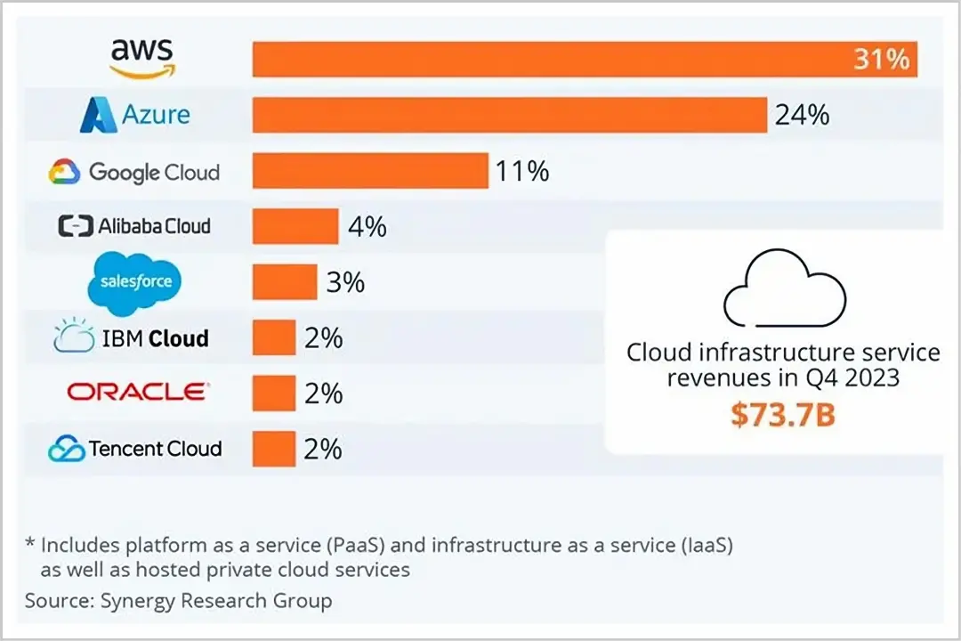 2023年,AWS依然豪占31%的市场份额,力压微软、谷歌,稳居全球第一;销售额更高达908亿美元,是亚马逊业绩暴增的中流砥柱。